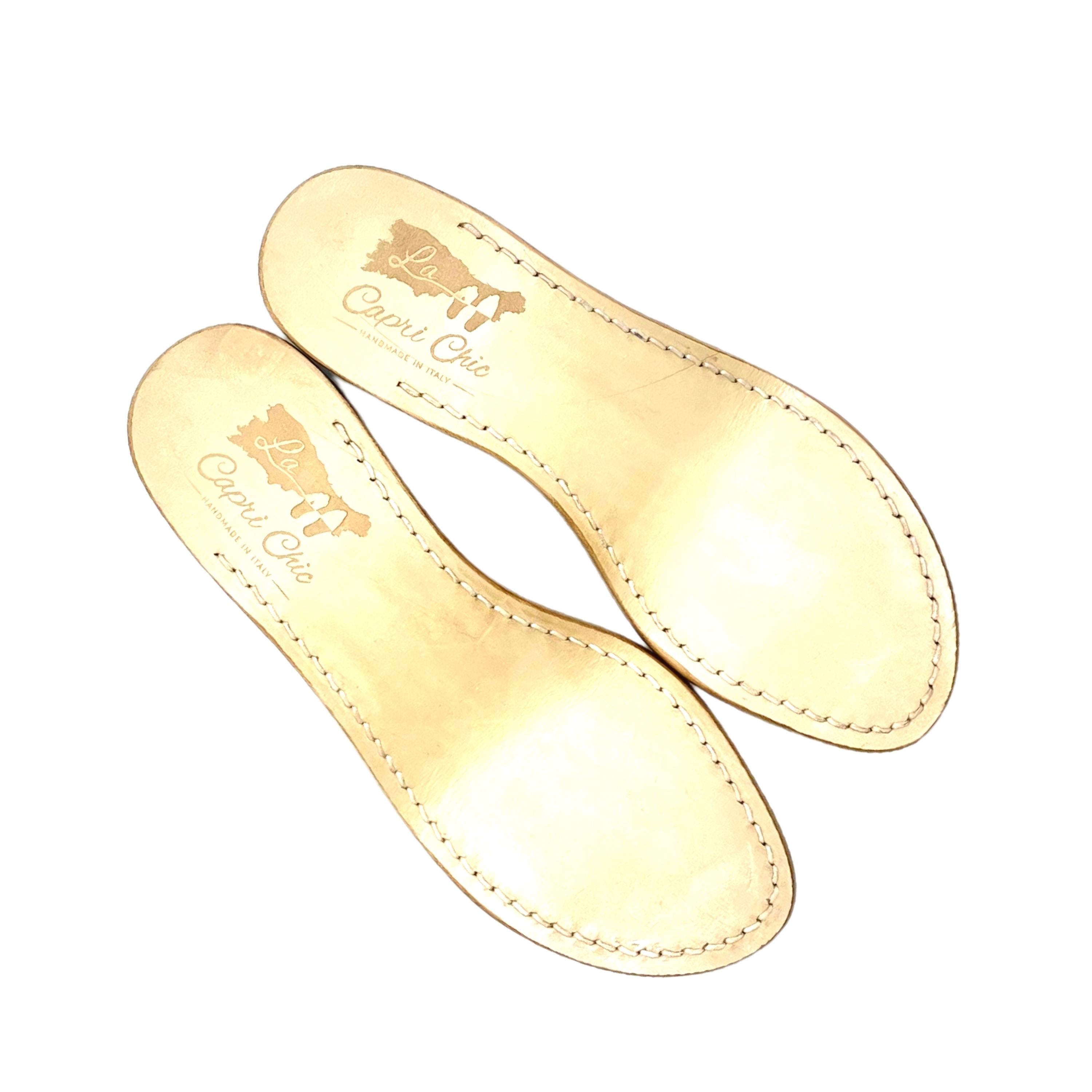 Each of our soles comes together with different layers of Italian leather. These layers are pressed with each other and sewn together. They adapt to the natural curves of the foot, and are equipped with non-slip rubber which make them ultra resistant.